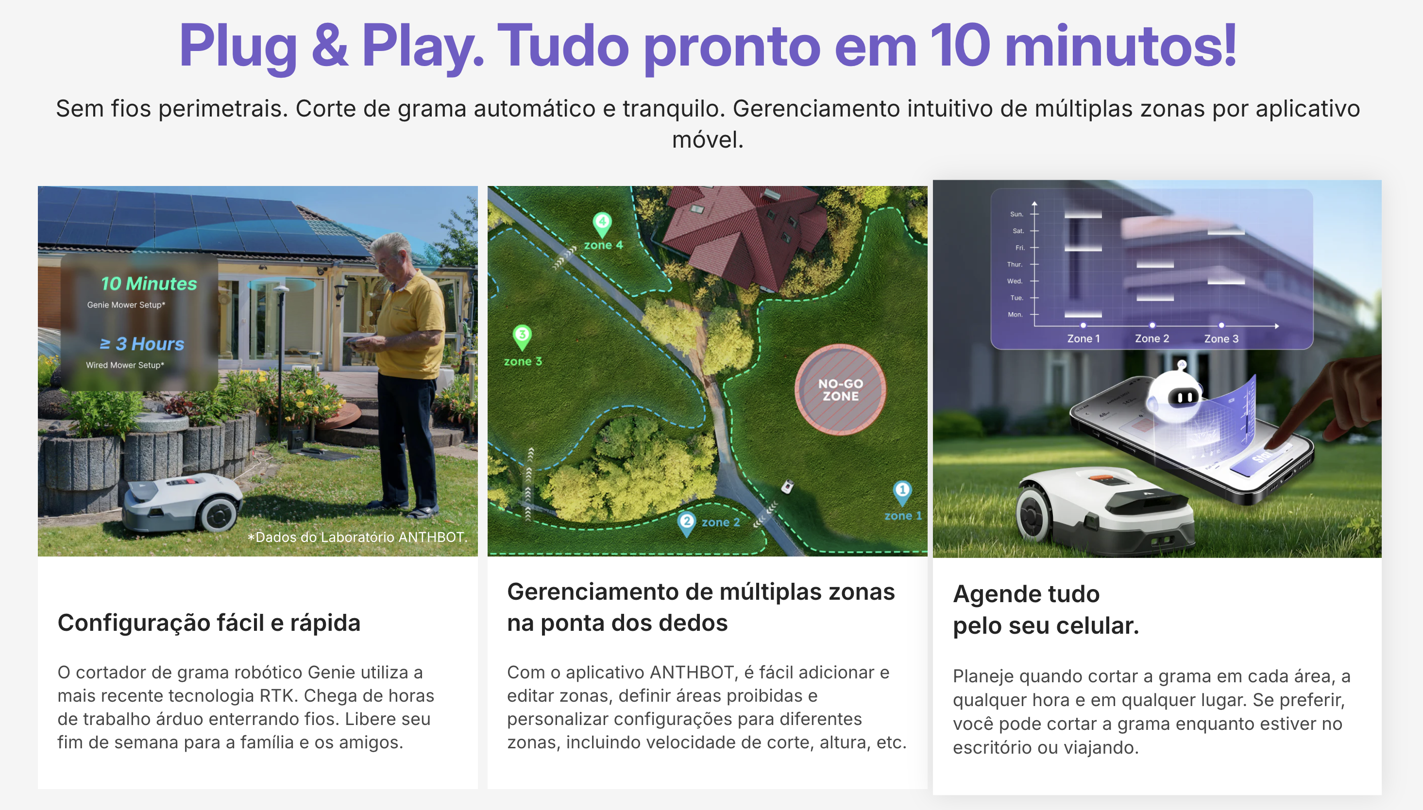 O Anthbot Genie 3000 é o que existe de mais avançado no cuidado inteligente com o gramado. Um robô totalmente automático, sem fios e com navegação de precisão milimétrica graças ao sistema RTK GPS combinado com quatro câmeras 3D Vision. Ele mapeia e trabalha sozinho em áreas de até 3600 m², reconhece obstáculos, cria rotas eficientes e mantém um corte impecável sem que você precise instalar cabos ou acompanhar o processo.